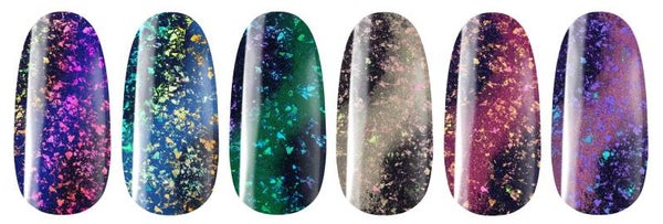 Met behulp van de glinsterende vlokken in onze Mystic Cat Eye gellakset kun je de helderste ontwerpen maken. Onze Mystic Cat Eye set werkt ook als display en wordt zo een decoratief accessoire voor je manicuretafel en een stukje weerstand in je salon!