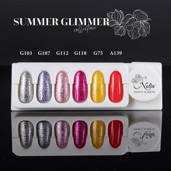 Glimmer is een extra glitterend assortiment, het dekt perfect in 2 dunne lagen en de zilverkleurige vlokken in de glas-in-lood kleur geven een bijzonder speelse of elegante uitstraling. Verkrijgbaar in verschillende tinten.