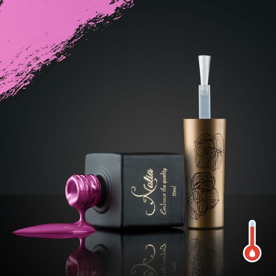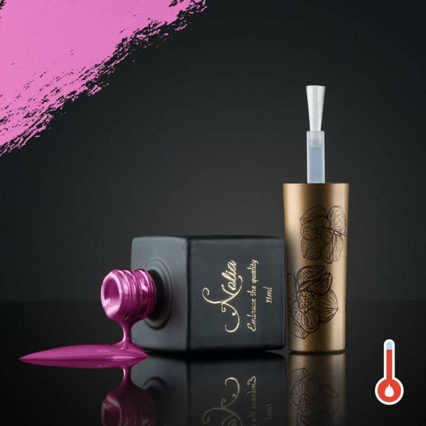 Een gellak die van kleur verandert afhankelijk van de temperatuur. Op de eerste foto zie je de kleur als de temperatuur laag is (20 ° C) en op de tweede foto de kleur als de temperatuur hoog is (45 ° C). De kleuren kunnen er op de nagels iets anders uitzien, afhankelijk van de omgeving of het lichaam