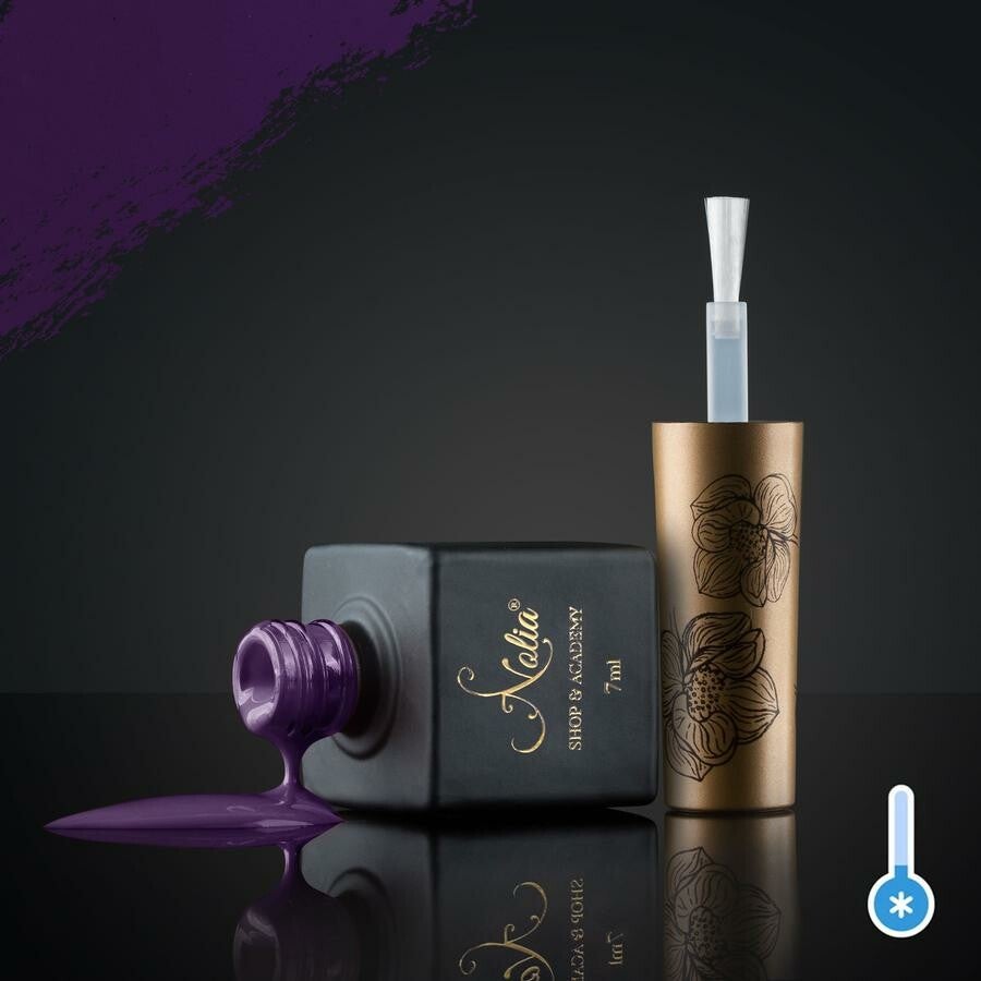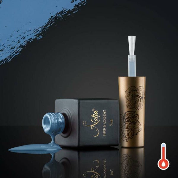 Een gellak die van kleur verandert afhankelijk van de temperatuur. Op de eerste foto zie je de kleur als de temperatuur laag is (20 ° C) en op de tweede foto de kleur als de temperatuur hoog is (45 ° C). De kleuren kunnen er op de nagels iets anders uitzien, afhankelijk van de omgeving of het lichaam