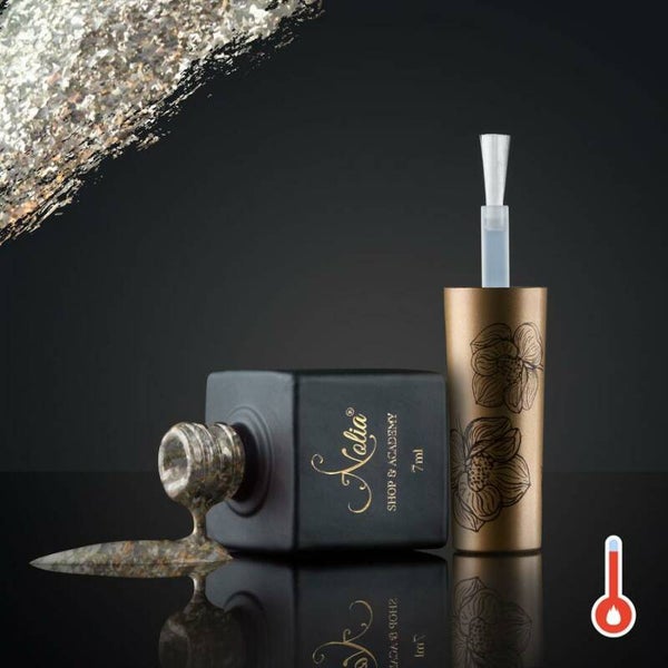 Een gellak die van kleur verandert afhankelijk van de temperatuur. Op de eerste foto zie je de kleur als de temperatuur laag is (20 ° C) en op de tweede foto de kleur als de temperatuur hoog is (45 ° C). De kleuren kunnen er op de nagels iets anders uitzien, afhankelijk van de omgeving of het lichaam