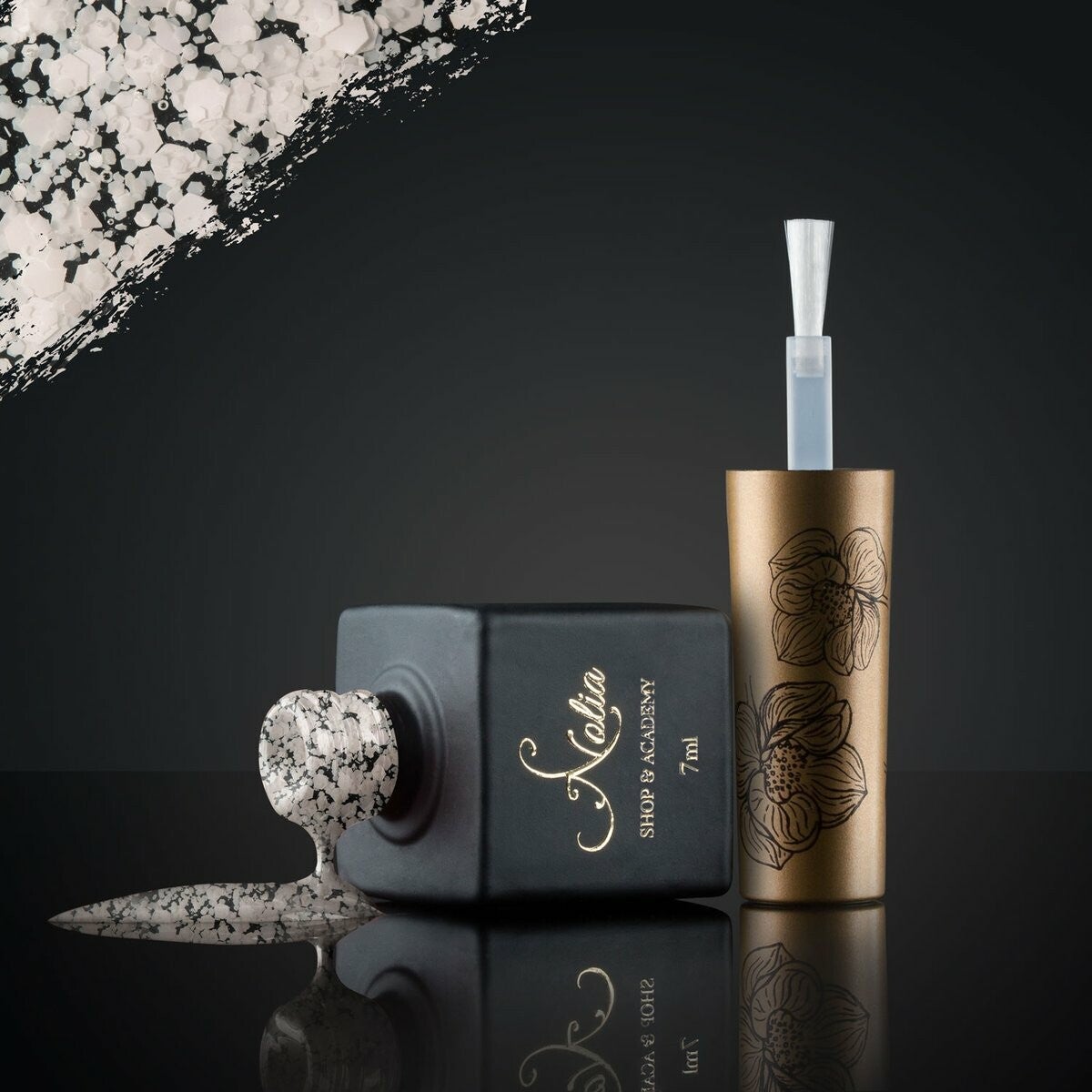 de tinten zijn halfdoorschijnend verrijkt met witte pailletten van verschillende groottes